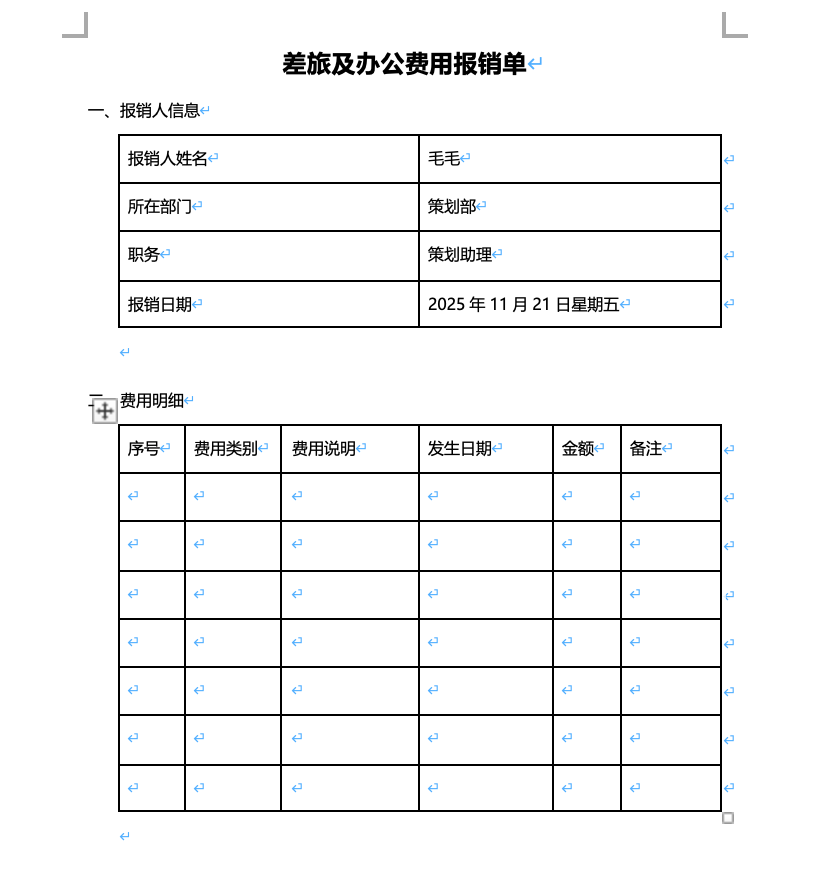 第一步:打开报销单文档,准备填写